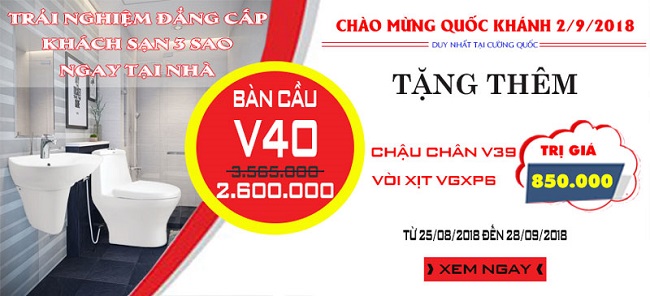Đặc biệt, để chào mừng quốc khánh 2 -9, Showroom Thuận Dũng thực hiện chương trình khuyến mãi hấp dẫn là khi mua bồn cầu Viglacera V40 ngoài được giảm giá lên đến 28% quý khách còn được nhận bộ quà tặng hấp dẫn trị giá 850.000 đ. Mọi thông tin chi tiết về thiết bị vệ sinh Viglacera quý khách hàng vui lòng liên hệ 0978 894 688 hoặc đến trực tiếp showroom Thuận Dũng tại 351 Trường Chinh, Thanh Xuân, Hà Nội để được tư vấn tận tình nhất.