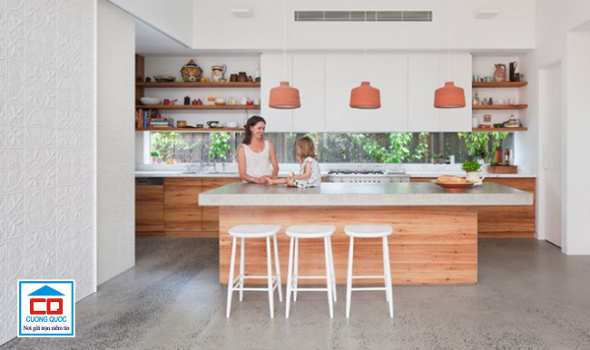Không nên dùng vật liệu lát sàn bằng gỗ, trường hợp bếp liền với phòng khách đã lát gỗ cũng cần phải nâng sàn bếp lên cao hơn hơn và lát bằng vật liệu gạch men. Muốn thay thế gạch bằng một vật liệu khác thì có thể phủ lên sàn một lớp nhựa tổng hợp vinyl với nhiều hoa văn phong phú, chống thấm nước và dễ lau chùi.