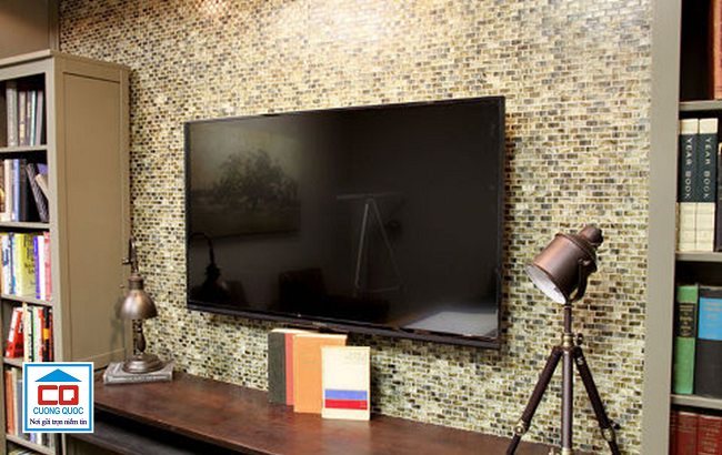 Nếu bạn đang lăn tăn không biết nên chọn loại gạch nào ốp lát phòng khách thì đừng ngần ngại chọn gạch ốp mosaic. Hiện nay, trên thị trường ngoài gạch men thì gạch mosaic thủy tinh chính là sự lựa chọn chuẩn chỉnh nhất dành cho các gia chủ cá tính. Độ sáng bóng của gạch thuyết phục bất kỳ gia chủ khó tính nào. Chưa kể họa tiết và màu sắc của từng viên gạch trang trí mosaic như kính vàng, kính xanh, … sẽ khiến bạn đổ gục ngay tắp lự. Phòng khách hứa hẹn sẽ đủ nổi bật khi dùng gạch ốp mosaic thủy tinh này để ốp tường.